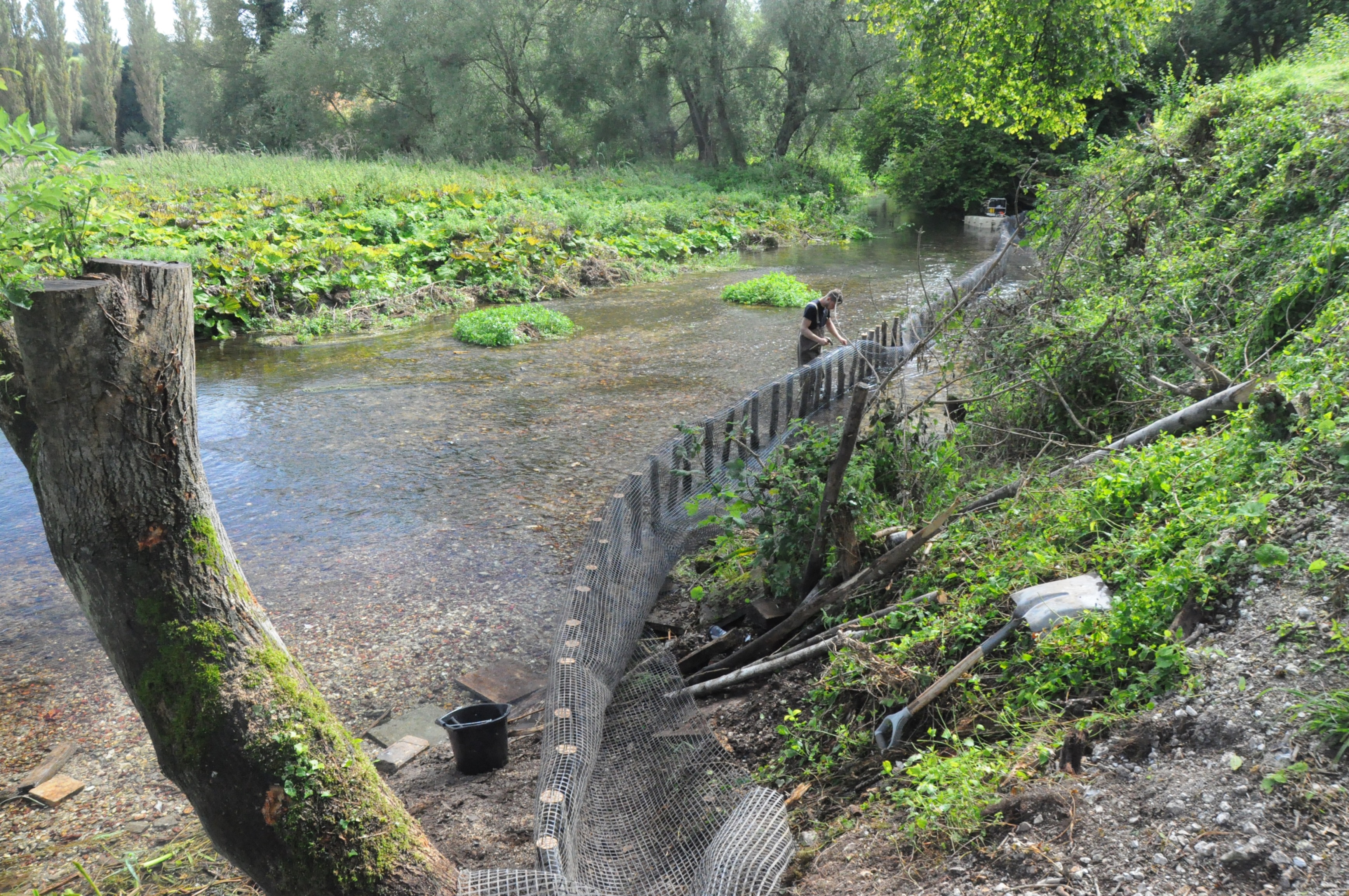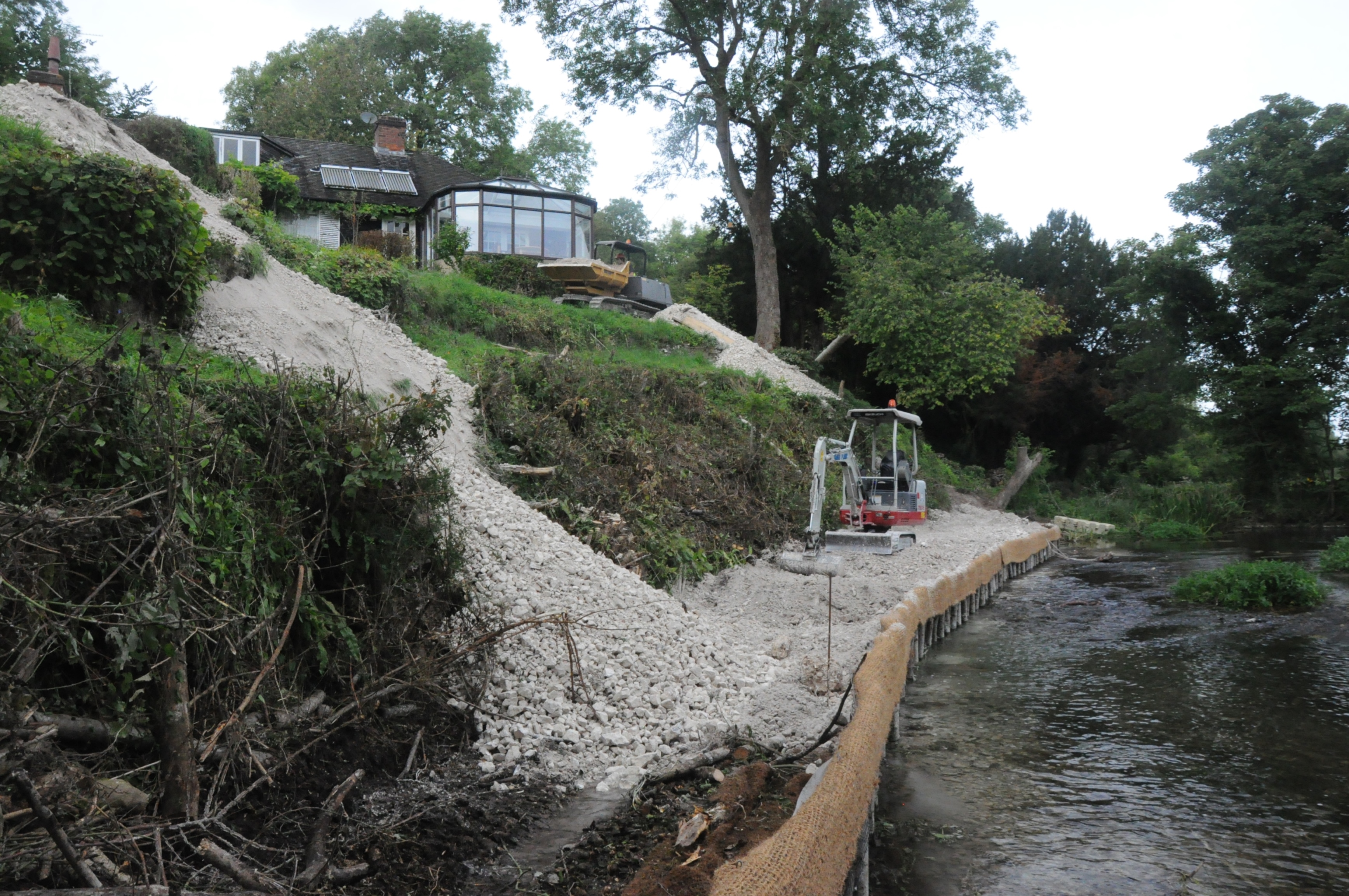 The steep and heavily eroded bank was stabilised by the installation of a chalk buttress at its toe.
