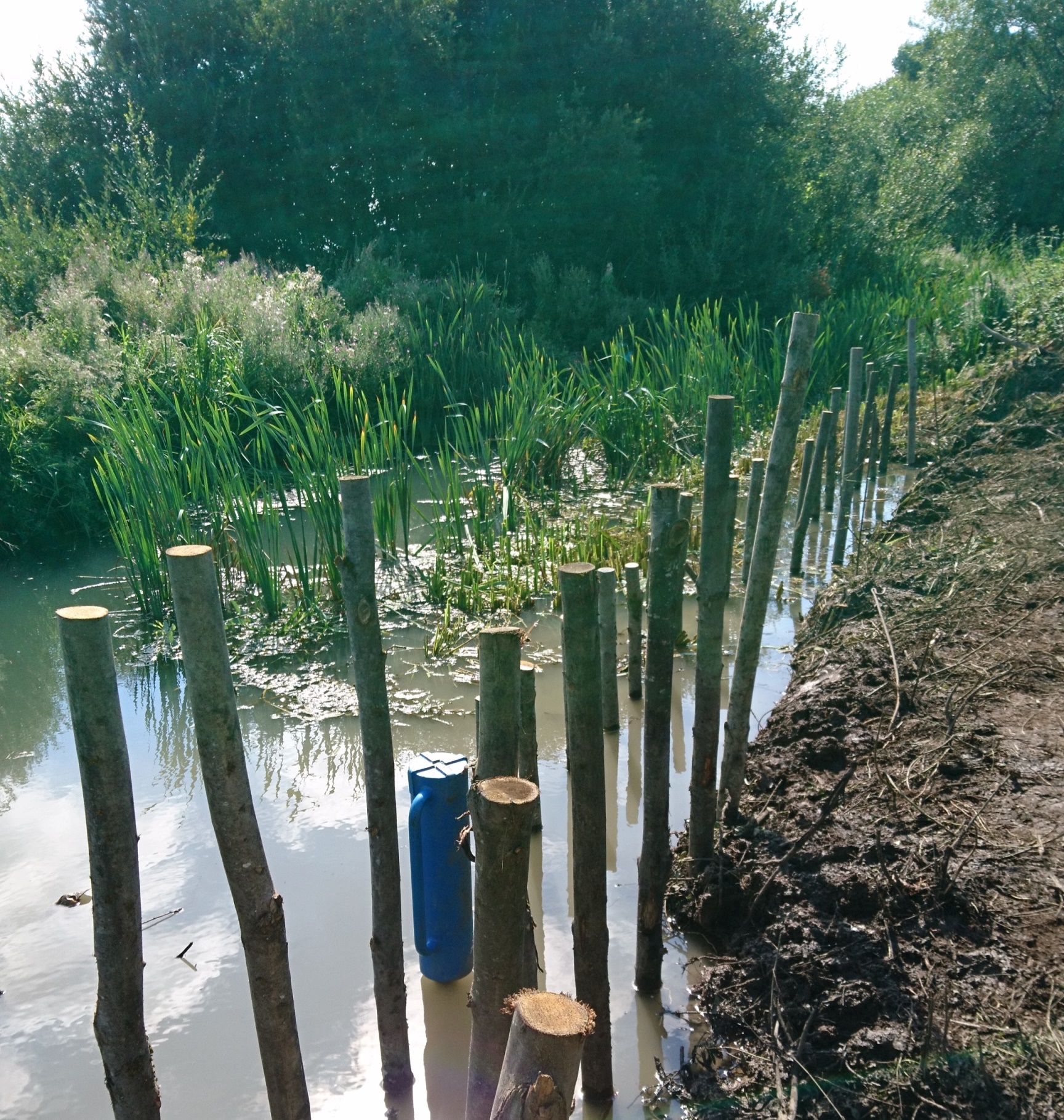 The breach in the stream bed was plugged using a filling of clay, gravel, and membranes designed to collect sediment and completely stop the flow of water. Additionally, a coirnet revetment was installed to reinstate the bank and stop continuing erosion.