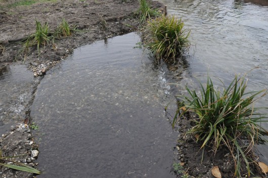 Following a period of detailed consultation, (during which our consultants negotiated a mutually agreeable solution with the Environment Agency and local parish council), our project site manager and his team of river technicians removed the failing structure and replaced it with a custom-designed stepped fixed-sill (rock ramp) weir created from locally sourced materials to create a new fish pass. On completion, the new structure was planted up with site-won sedges and other rhizomeiferous plants such as Meadowsweet (Filipendula spp) to stabilise the new bank margins and bio-engineered wing walls.