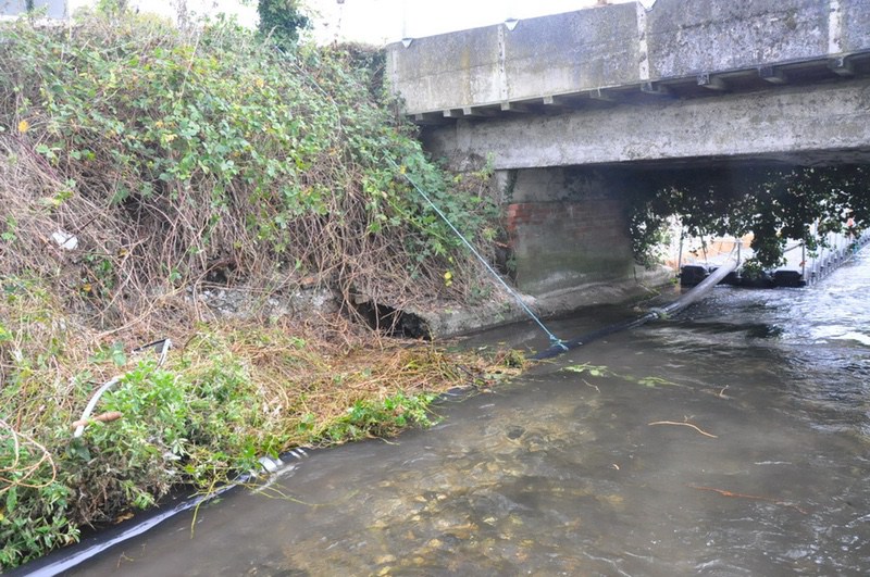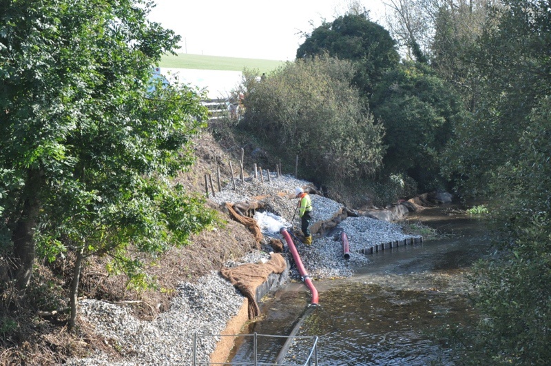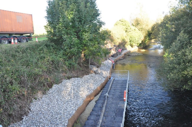The structure consisted of a 3-tier protective revetment installed along the 45m of left bank downstream of the farm access bridge. This bio-engineered structure is constructed from geotextile, which was retained with sweet chestnut stakes installed from a floating works platform. Gravel was then placed behind the geotextiles, using an innovative, low impact pumping system, and finally the back-fill area was planted with live willow stakes.