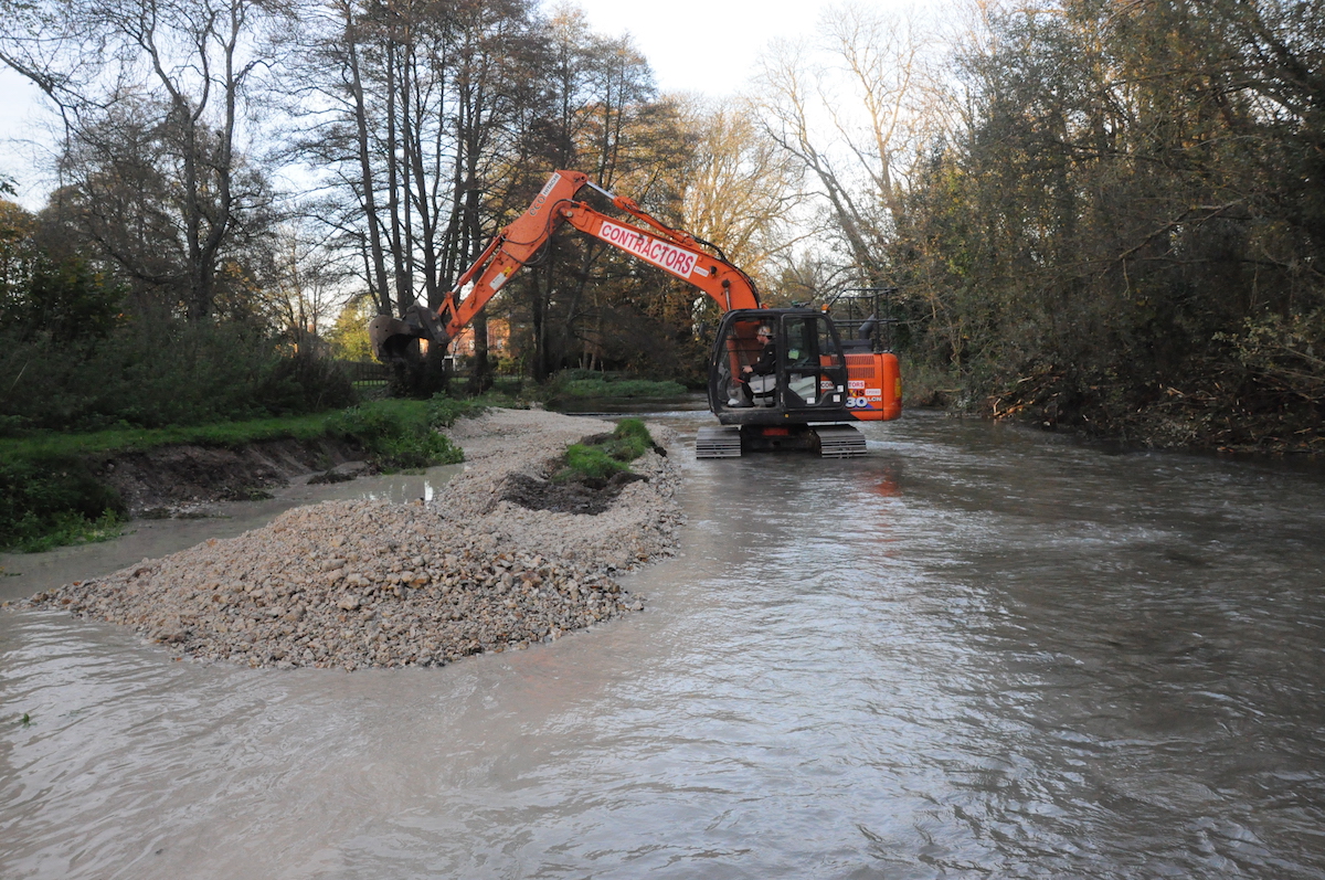 This over-wide, upper river section was reduced in width by approximately 40% to create an optimal depth-to-width channel profile. The new bank margin was constructed from ‘As dug’ gravel from an extraction point in the adjacent floodplain (3) and re-planted with site-won root stock from the original bank (see mid-left of shot). A light gravel-dressing of the channel bed was also undertaken to introduce an element of large flint cobbles for invertebrate feeding stations and juvenile salmonid habitat. Regarding the re-sizing of channels? – this is an undertaking best decided upon at the time of installation and a calculation that requires experience and careful consideration. Ideally this work is best undertaken during periods of low flow to ensure that energy throughput (depth and speed of flow) is sufficient to ensure that established habitat characteristics (eg.optimal Ranunculus conditions) are resistant to drought.