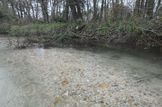 Dredged, dammed-up river channels act as huge sediment repositories. They appear dark, dead and bottomless due to the blanket covering of eroded agricultural soil, rubber tyre granules and chemical compounds flushed into the river from roads and agricultural land drains in the upstream catchment. These unwanted alien substrates combine with a cocktail of chemicals including Phosphates and Neonicotinoid insecticides to create a toxic and severely degraded in-stream habitat.