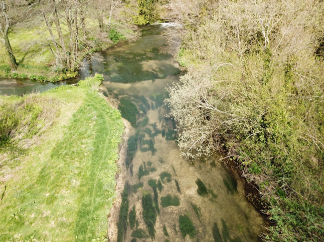 April 2019 – The image shows fast flows discharge over pipe bridge riffle into the central House Beat. Now that Ranunculus has bulked out the flows, the oxygenated riffle pool is a prime holding area for both stocked and wild fish. They are challenging for the visiting angler to see due to the choppy surface conditions, but the fish are there and in significant numbers. This is also a prime location for Blue Winged Olive hatches. On-going monitoring of invertebrates is underway.