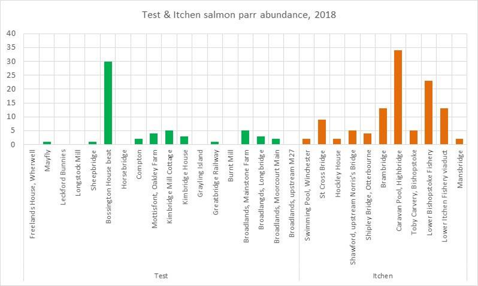 The graph compares the catches of salmon parr at all of the Catch Per Unit Effort (CPUE) surveys that we conducted on the Test & Itchen in the summer of 2018: the sites are set out from upstream to downstream, (left to right on the graph). One site on the Itchen did trump Bossington, but only just!