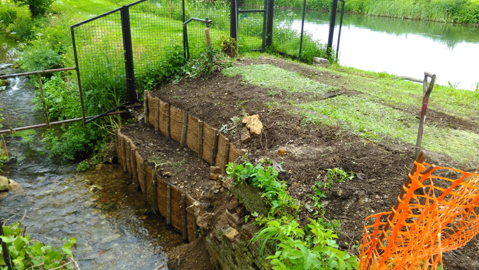 I am pleased to report that a little bit of self-seeding has naturally happened, but the bank, soil and supporting structures, have stood amazingly firm, the watermark delineating how far the water climbed up the new bank face is clearly visible, so great job and many thanks.”