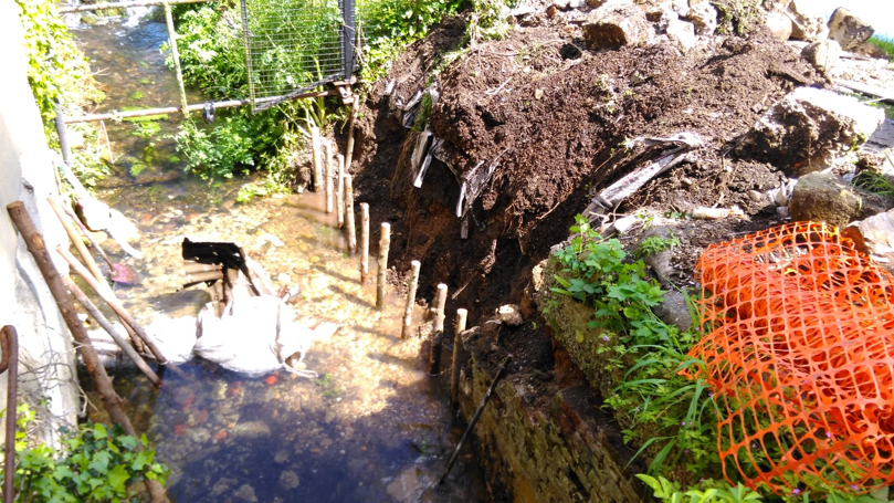 Temporary works using concrete and sandbags had been installed to protect against any further short-term erosion but a more robust permanent solution was urgently required. Cain BioEngineering was commissioned to design and build a long-term solution to protect against further bank erosion and masonry collapse.