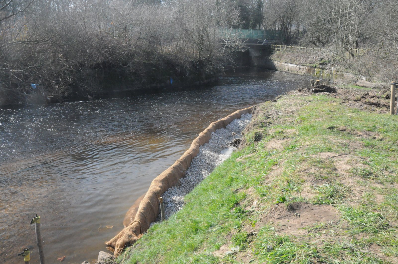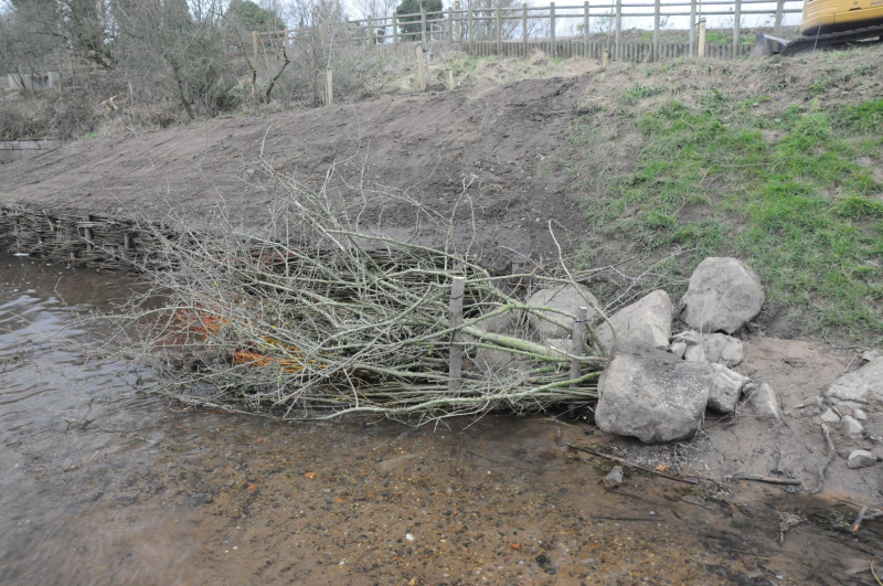 The original consent obtained by the client was for a rip-rap bank protection using rock rolls & geotextile matting. However, after a review by CBE an alternative solution, using cheaper and more sustainable materials was developed. The chosen solution involved the construction of an erosion-resistant and natural-looking bank revetment utilising willow spilling with a geotextile and gravel-retained ‘coirnet’ on the landward side. The works also incorporated live willow woody material to help deflect flow away from the bank.