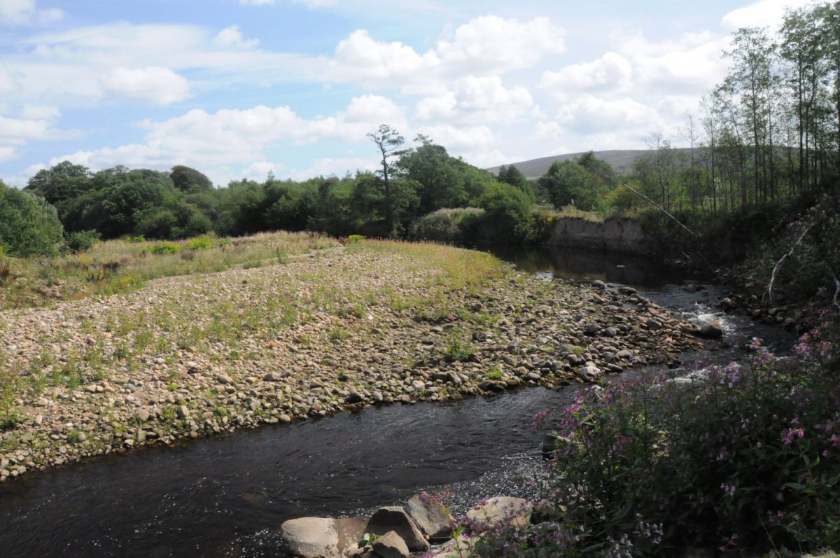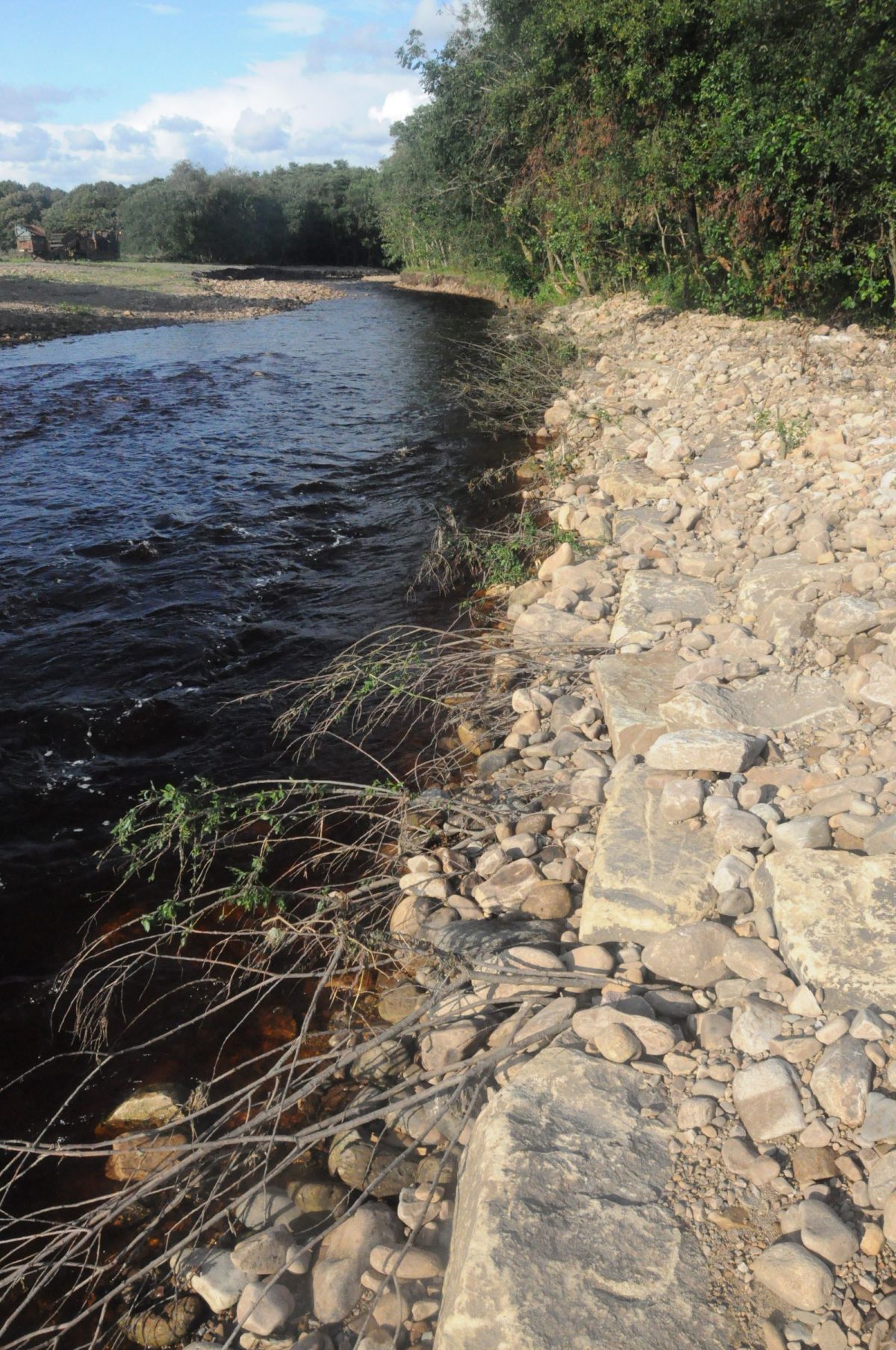 Upstream view of reclaimed floodplain with back-filled and covered 3 tier coirnet revetments