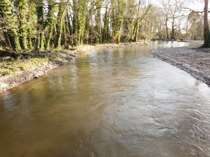 Note the raised trapezoidal flood bund right of shot, constructed from dredged river bed material to retain impounded flows at a significant elevation above the natural flood plain. The natural flood-plain water meadow level is marked by the fence line centre-right of shot. One of the key project objectives and justifications for contributory Environment Agency funding was the removal of the raised bund in its entirely to re-connect the river with its natural flood-plain.